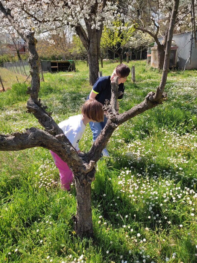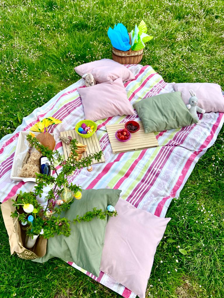 Ecco allora che individuata una porzione di prato poco scoscesa costellata di bianche margheritine, all’ombra di un ciliegio in fiore e sullo sfondo alberi da frutto, abbiamo posizionato subito la nostra tovaglia pastello, cuscinoni, coniglietti e…che il Glampic abbia inizio!